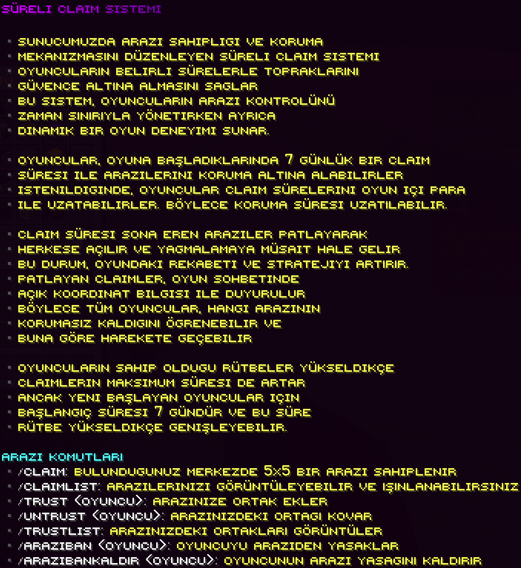 Süreli claim sistemi, oyuncuların arazilerini belirli bir süre boyunca koruma altına almasını sağlayan sistemdir. Süre dolduğunda koruma kalkar ve arazi herkese açık hale gelir.