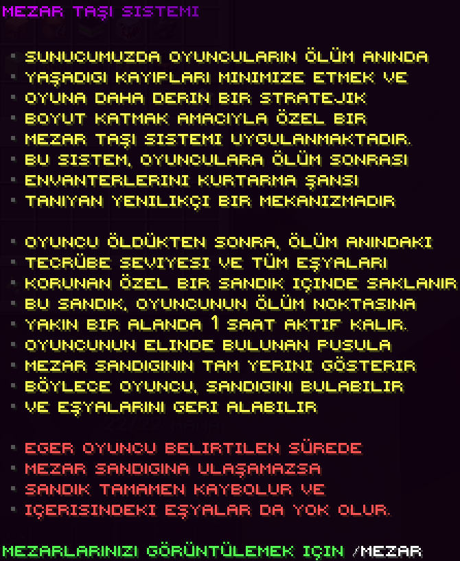 Mezar taşı sistemi, öldüğünde eşyalarının kaybolmasını engelleyen ve onları geri alma şansı sunan sistemdir. Öldüğünde envanterin ve XP’in mezar sandığında saklanır.