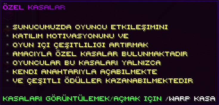 Sunucuda bulunan özel kasalar, oyuncuların farklı aktiviteler sonucunda elde ettiği anahtarlarla açabildiği ödül sistemidir. Her kasa, kendine özel ödüller ve erişim yöntemleri içerir.