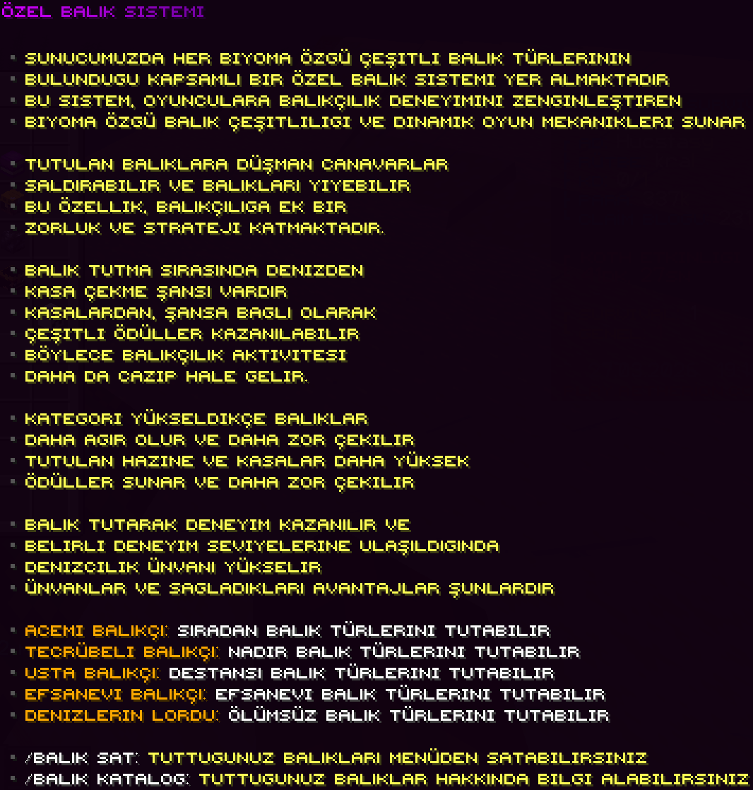 Canavar saldırılarına karşı dikkatli ol. Nadir balıklar daha zor yakalanır. Biyoma göre balık türleri değişir.