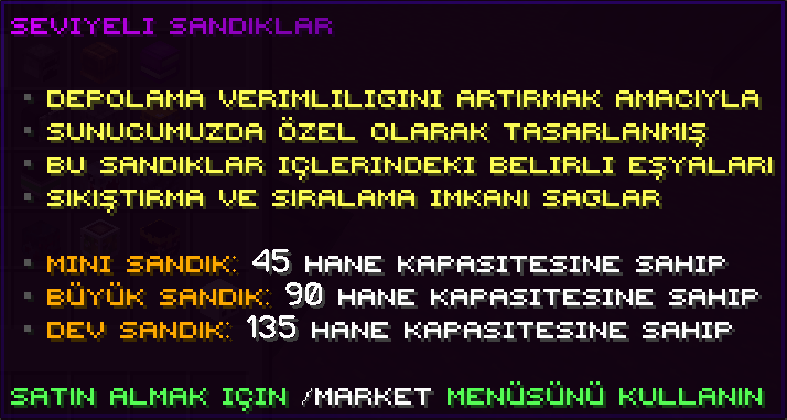 Seviyeli sandıklar, yüksek kapasiteye sahip ve eşyaları sıkıştırarak daha verimli depolama sağlayan özel sandıklardır. Normal sandıklara göre çok daha fazla eşya depolayabilirsin.