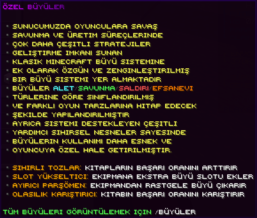 Özel Büyüler Sistemi Nedir? Özel büyüler sistemi, klasik Minecraft büyülerine ek olarak sunucuda bulunan gelişmiş büyü sistemidir. Bu sistem sayesinde ekipmanlarını çok daha güçlü ve özel hale getirebilirsin.